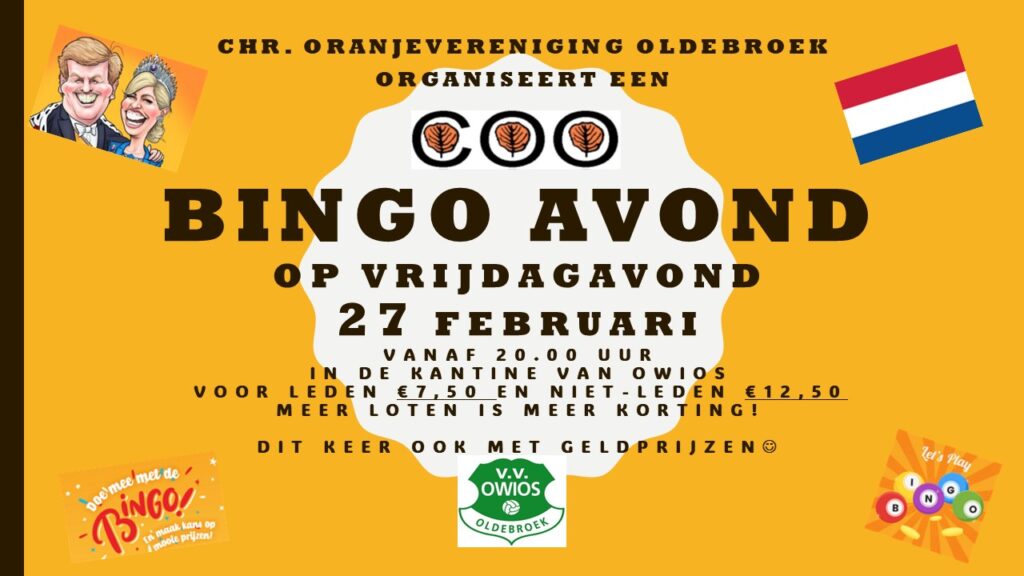 Het bestuur van de Chr. Oranjevereniging Oldebroek nodigt u uit voor een gezellige bingoavond! U bent op vrijdagavond 27 februari 2026 vanaf 19.30 uur van harte welkom in de kantine van voetbalvereniging OWIOS te Oldebroek. Om 20.00 uur gaan we van start met de bingo. Dit keer naast de gebruikelijke prijzen ook geldprijzen. Zowel leden als niet-leden van de Chr. Oranje vereniging Oldebroek zijn allen van harte welkom!